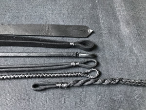 A pair of early prototype hybrid bullwhips, based on the popular "performance hybrid" model. Featuring carbon fiber handles with 5ft, 12 plait thongs and interlaced dacron falls. a design that is still in development.