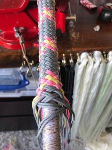 A special order, consisting of specially requested colors. This is the handle section, being plaited over the two bellies below, over which there is an artificial sinew foundation, with a secondary dacron reinforcement layer between each of the bellies.