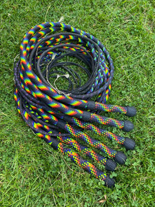 Customer photo of a group of bullwhips made over time, with similar patterns, 3 pairs in total, two 20 plait and one 32 plait pair, all with dacron points.